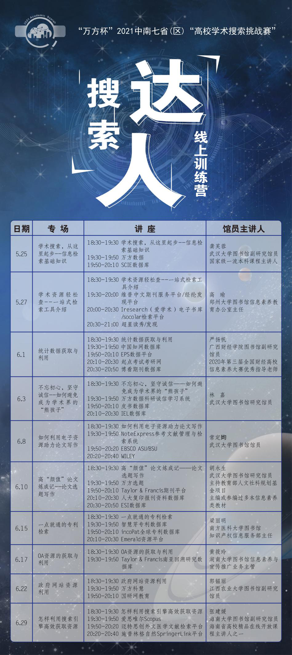 2021年,为提升中南七省(区)高校在校生的信息素养、促进学术资源利用、加强高校图书馆信息素养教育合作交流,中南七省(区)高校图工委决定联合举办“万方杯”2021中南七省(区)高校“学术搜索挑战赛”。